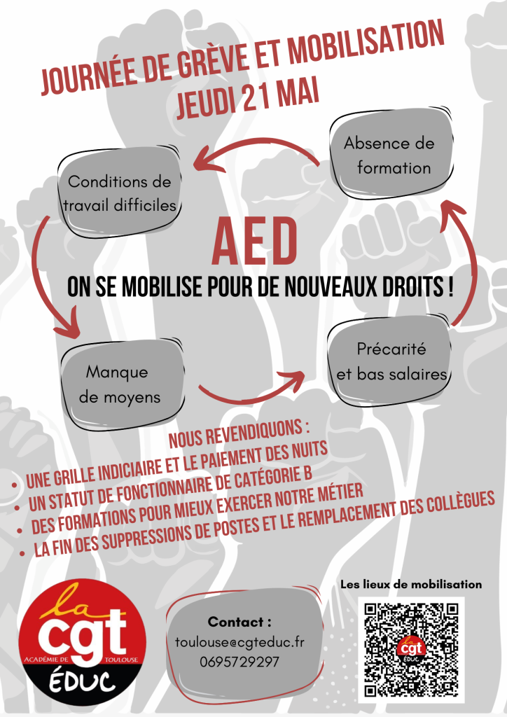 Elle s’adresse à l’ensemble des AED de l’académie, et il y aura des points de rassemblement dans tout le territoire. Nous revendiquons notamment :